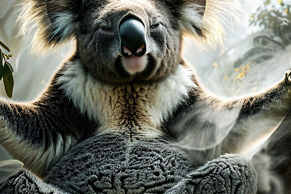 Een prachtig ontwerp van een ontspannen koala die mediterend in een eucalyptusboom zit. Het licht dat door de bladeren schijnt, geeft een serene sfeer en benadrukt de natuurlijke schoonheid van de koala en zijn omgeving. Perfect voor natuurliefhebbers en een geweldige toevoeging aan elke ruimte die een rustige en natuurlijke uitstraling zoekt.