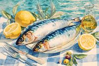 Op een blauw-wit geblokt tafelkleed aan zee staat een artistiek bord met een delicate aquarelafdruk, waarop vers bereide sardientjes zijn gerangschikt. Ernaast liggen een vork en een mes, klaar om gesmuld te worden. Aan de rand van het bord maken groene olijven en felgele citroenhelften het mediterrane stilleven compleet.