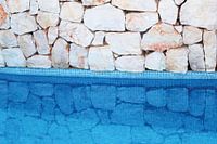 De muur van natuursteen weerspiegelt in het water van het zwembad op een hete zomerdag in Andalusië, Andalucia, Spanje. Lekker afkoelen, zwemmen, ontspanning, zomergevoel, vakantieherinneringen. Neem een frisse duik!