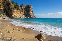 De rotsachtige baai genaamd Cala Moraig betovert met zijn zandstrand, helder water en steile kliffen. Op de achtergrond rijst de imposante klimrots Morro Falquí op. Lichte kalksteen ontmoet zand en blauw zeewater.