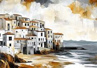 Details: Middellandse Zee, kustlijn, traditionele architectuur, zeezicht, kunst, schilderij kustlijn, rotsachtige kust, huizenschilderij, landschapsschilderij, Europese…