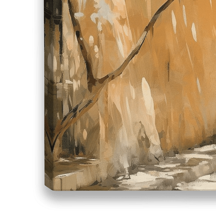 Mediterrane Straatscene - Het schilderij toont een pittoreske straat met traditionele Mediterrane architectuur. Overhangende bloesembomen voegen een zacht, natuurlijk element toe, terwijl het spel van licht en schaduw een warme en uitnodigende sfeer schept. De penseelstreken zijn expressief, waardoor een bijna impressionistisch gevoel ontstaat, en aardetinten domineren het kleurenpalet, aangevuld met helderwitte en subtiele groentinten.
