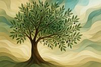 Een sierlijke olijfboom staat centraal, met een gevlochten stam en takken vol olijfvormige details. De achtergrond bestaat uit gelaagde, golvende stroken die in zachte aardetinten en koelere blauwen door elkaar meanderen, wat een rustgevende diepte geeft. Het ritme van de organische lijnen contrasteert subtiel met de compacte…