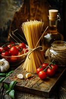 Dit gedetailleerde stilleven toont een bundel spaghetti op een rustieke snijplank, omringd door verse ingrediënten zoals tomaten, basilicum en knoflook. De zorgvuldige schikking en natuurlijke kleuren maken dit schilderij tot een perfect decoratiestuk voor keukens en eetkamers. Ideaal voor fijnproevers en liefhebbers van de mediterrane…