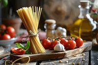 Dit gedetailleerde stilleven toont een bundel spaghetti op een rustieke snijplank, omringd door verse ingrediënten zoals tomaten, basilicum en knoflook. De zorgvuldige schikking en natuurlijke kleuren maken dit schilderij tot een perfect decoratiestuk voor keukens en eetkamers. Ideaal voor fijnproevers en liefhebbers van de mediterrane…