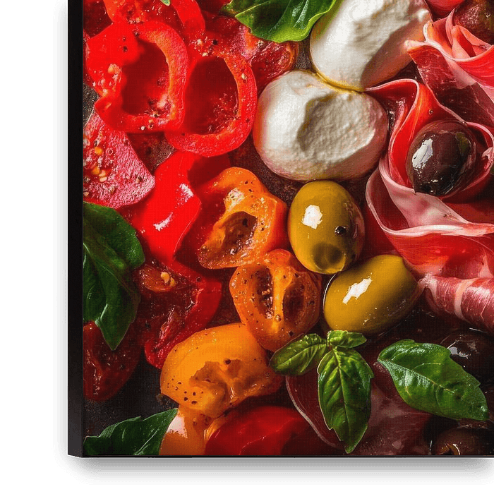 Een feest van kleuren en smaken ontvouwt zich in deze kunstige compositie van verse tomaten, delicate kaas, pittige ham en groene olijven. Het samenspel van rijpe groenten en hartige ingrediënten wekt de verwachting van culinaire hoogstandjes en nodigt uit om samen te eten. Ideaal voor in de keuken of eetkamer, waar smaak en…