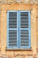 Verweerde houten Louvre deuren (luiken, raamluiken, blinden, vensterluiken, shutters) als zonwering in Grieks blauwe kleur. Raamkozijn en venster in rustieke oude muur zoals je vaak tegenkomt in Zuid-Europa en landen rond de Middellandse Zee.