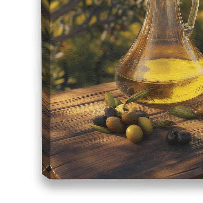 Dit kleurrijke stilleven vangt de essentie van het mediterrane leven. Rijpe olijven en gouden flessen olijfolie rusten op een rustieke houten tafel, omringd door weelderige olijfbomen onder de warme zon. De gedetailleerde weergave en levendige kleuren voeren je rechtstreeks mee naar een mediterraan landschap, ideaal voor keuken- of eetkamerdecoratie. Een perfect kunstwerk voor fijnproevers en liefhebbers van de mediterrane keuken.