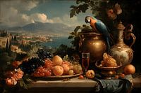 Het schilderij toont een weelderig stilleven met een mediterraan karakter. Gouden vaten, een sierlijke kan, een glas rode wijn, sappige druiven, perziken en ander fruit zijn op de voorgrond gerangschikt op een marmeren tafelblad. Een prachtige blauwe ara zit op een gouden kan en trekt het oog naar boven, waar de achtergrond zich opent:…
