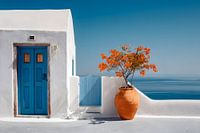 De foto toont een minimalistisch mediterraan tafereel: een witgekalkt huis met een felblauwe deur en een houten poortje dat uitkomt op het terras. Ernaast staat een grote terracotta amfoor met een kleine boom waarvan de oranje bloemen oplichten in de zon. Op de achtergrond strekt de diepblauwe zee zich uit tot aan de horizon, erboven…