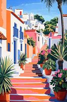 Een sfeervolle mediterrane straatscène met een oplopende trap omringd door witgepleisterde huizen in zachte pasteltinten. De compositie wordt verlevendigd door felblauwe deuren en luiken, terracotta bloempotten met weelderige palmen en tropische planten, en warme roze-oranje treden die sierlijk omhoog leiden. De architectuur en het…