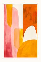Een warme gloed van oker, perzik en diep oranje verspreidt zich over het beeld als zonlicht dat langs verweerde mediterrane muren strijkt. Transparante lagen en zachte overgangen creëren een subtiel spel tussen licht en schaduw, terwijl de organische vormen als afgeronde bogen en vloeiende vlakken door de compositie bewegen.
