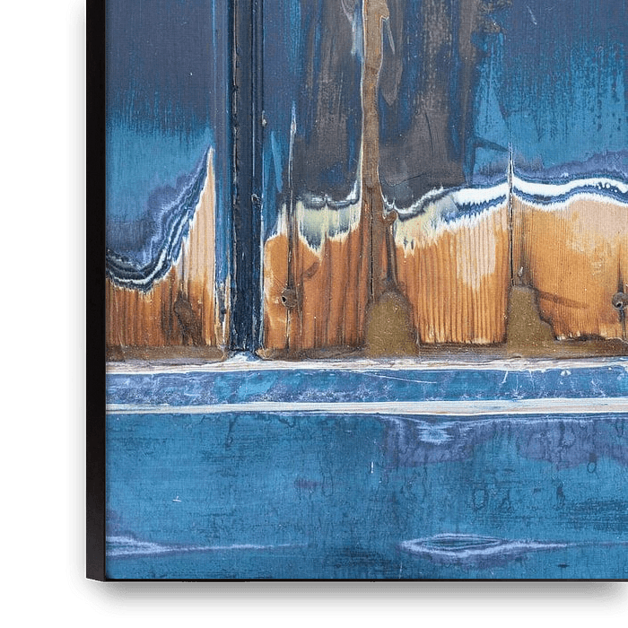 abstracte vorm van een deur die onderhoud nodig heeft. het schuren is gebeurd. het lijken net druppels die omhoog kruipen. het schuren geeft diepte, warme kleuren die je blij maken en aan de méditerranée / middellandse zee of Griekenland doen denken en een vakantie gevoel oproepen