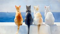 Vier katten op een wit muurtje in de zomerzon kijken uit over de blauwe Middellandse zee met een bootje in de verte.