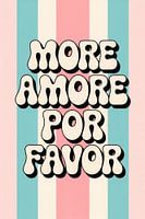 Retro groovy poster met de woorden "More Amore Por Favor". Gestreepte achtergrond in pastelroze, blauw en crème gecombineerd met jaren 70 typografie voor een kleurrijk, speels en opvallend retro-ontwerp.