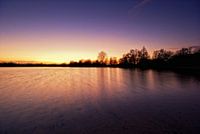 De foto toont een zonsondergang boven een meer met een onbewolkte hemel.
