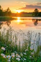 Een gouden zonsondergang kust zachtjes het kalme wateroppervlak, terwijl de wolken als dromerige penseelstreken de hemel versieren. Sierlijke grassen en tere bloemen omzomen de kust en weerspiegelen de kleuren van de lucht. Het landschap straalt een vredige harmonie uit die de kijker in een vrolijke, nostalgische stemming brengt.