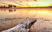 Meer met aangespoelde boomstam in het licht van de avondzon