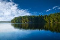 Meer in Zweden met witte wolken, blauw water en bomen aan de oever. Scandinavische natuur in het noorden