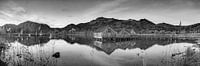 Meer in de Alpen in Beieren met drie boothuizen in zwart-wit van Manfred Voss, Zwart-Wit Fotografie