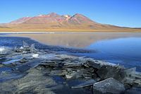 Als je een tocht maakt over de Boliviaanse hooglanden tussen de zoutvlakte van Uyuni en de Chileense Atacama woestijn dan kom je langs vele lagunes. Een aantal lagunes is in de winter bevroren of heeft een laag ijs langs de rand liggen. Tel daar de schitterend gekleurde bergen bij op en je hebt een heerlijk plaatje.