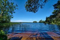 Meer in zweden met riet en een rust gevend karakter in de zomerse zon. Het blauw in het water of in de lucht overheerst het beeld met aan de oevers loofbomen en wat zand