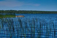 Meer in zweden met riet en een rust gevend karakter in de zomerse zon. Het blauw in het water of in de lucht overheerst het beeld