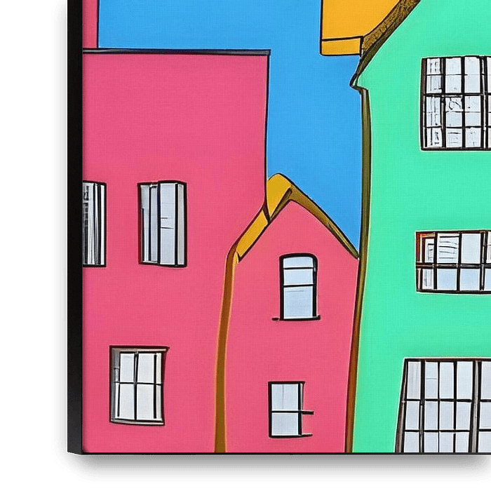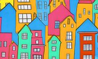 Kleurige printen, abstract, figuratieve illustraties met afbeeldingen van huizen, grachtenpanden uit diverse landen en steden.