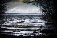 Meer met donkere golven aan de oever bij slecht stormweer in het bos en zonnestralen in de lucht, landschap, kopieerruimte, geselecteerde focus