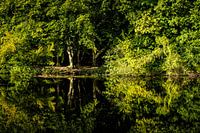 Reflectie van bomen op een open plek bij een meer