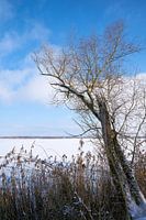 Oude wilgen aan de oever van het ijskoude Barlebermeer in het noorden van de stad Maagdenburg op een koude winterdag