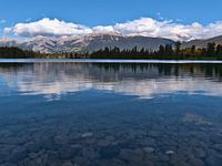 Gezicht op Lake Beauvert in Jasper, Alberta, Canada in de Rocky Mountains met ronde stenen in het heldere water en met wolken bedekte bergen weerspiegeld in het oppervlak van het meer op een zonnige dag in de herfst.