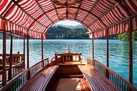 De foto toont een Pletna, een van de traditionele houten roeiboten, die vandaag de dag nog steeds met spierkracht naar het zee-eiland varen.