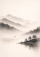 Sereen minimalistisch landschapskunstwerk met in de mist bedekte bergen, een kalm meer en zachte monochrome tinten. De vredige compositie roept stilte en evenwicht op, waardoor het een ideaal wandkunstwerk is voor Japandi, Zen, Scandinavische en moderne interieurs.