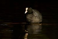 Door de laaghangende zon en donkere wateroppervlakte ontstond dit prachtige lichteffect op deze Meerkoet. Een mooie Zwart/Wit opname voor aan de muur.