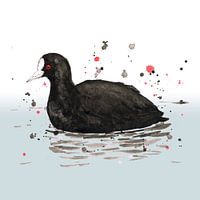 Een Oost-Indische inkt tekening van een schattige meerkoet, zwemmend in het water. wilde tekening in gewasseninkt.