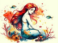 Een roodharige zeemeermin rust op de zeebodem, tussen vissen en koraal.