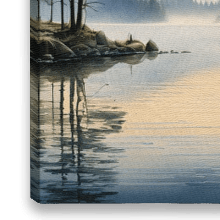 Een vredig tafereel van een kalm meer of water dat een dennenbos en bergen in de verte weerspiegelt onder een warme hemel.