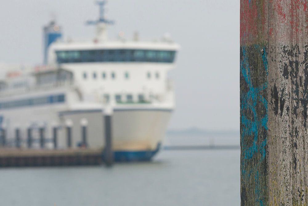 Meerpaal op de Waddendijk van Terschelling nabij West-Terschelling met op de achtergrond een veerboot