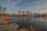 Sfeer (gevoel) bij deze prachtige zonsopkomst bij een meertje met een mooie houten steiger boven het water.
