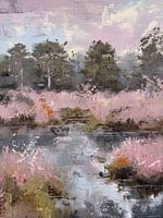 Het water reflecteert de roze heidestruiken. Dit kunstwerk is digitaal geschilderd en is gemaakt in prachtige roze tinten afgewisseld met wit blauw grijs en oranje accenten. Dit werk is er één uit een serie van vier kunstwerken in de zelfde stijl.