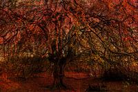 Meervoudige belichting boomstam met kale takken abstract in rood in de winter