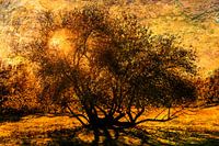 Meervoudige belichting kale boom tegen de achtergrond verlicht met zon in de winter