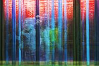 Veelvoudige blootstelling van kinderen in glasdoolhof bij een markt, kleurrijk abstract kunstbeeld, exemplaarruimte