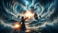 Als een scène uit een hoogwaardige manga vertelt deze afbeelding het verhaal van een krachtige heldin die de krachten van de zee beheerst. Omringd door enorme golven die oprijzen als dansende spiralen, staat de "meester van oceaanwervelingen" standvastig in haar kleine boot. De zon aan de horizon baadt het tafereel in een warm…