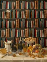 Een stilleven met champagne en cognac, kaas, fruit en boeken, veel boeken. Een picknick in de bibliotheek, lijkt het wel.