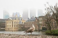 Een meeuw houdt de wacht als de hoge gebouwen achter Het Binnenhof en Het Mauritshuis in Den Haag verdwijnen in de lage bewolking.