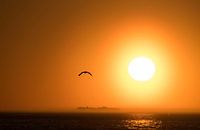 Een zeemeeuw die tegen de ondergaande zon over de zee heen vliegt met op de achtergrond een vrachtschip.