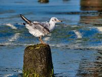Een meeuw met veren die door de wind uit elkaar gescheurd zijn, zit op een paal in zee.