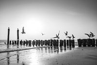 In deze dynamische zwart-witfoto uit Vlissingen stijgen meeuwen op vanaf een rij verweerde strandpalen, met de laagstaande zon als stralend middelpunt. De reflecties op het natte zand en de silhouetten van de vogels versterken de dramatische sfeer, terwijl het golvende water zacht de kust raakt. De compositie ademt zowel rust als…